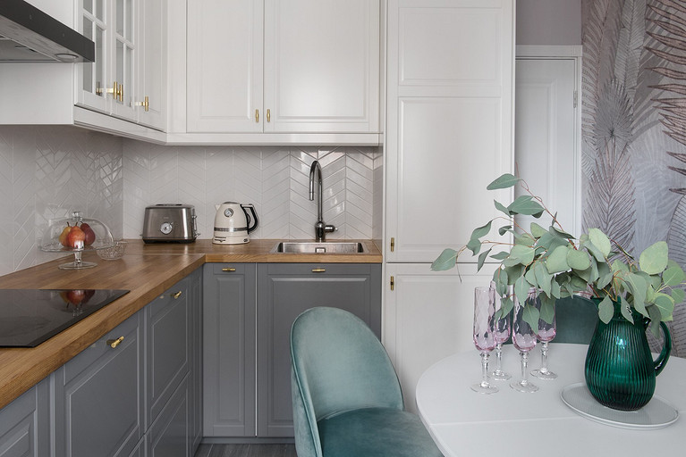 - Стены: краска Little Greene, обои Affresco, фартук из плитки Equipе