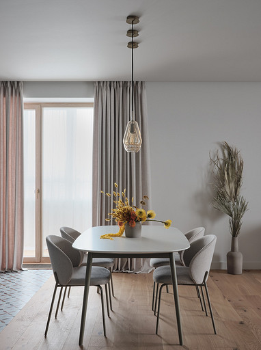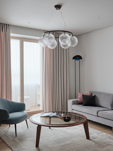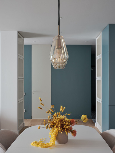 - Освещение: люстра Forestier, подвес над столиком и лампа на столе Nuura