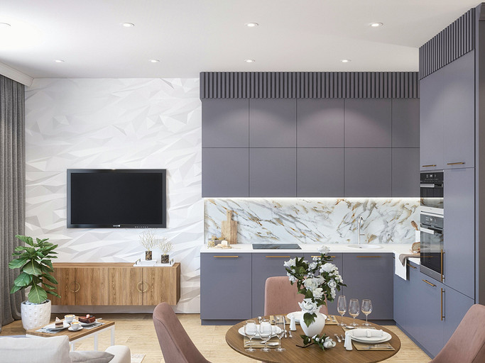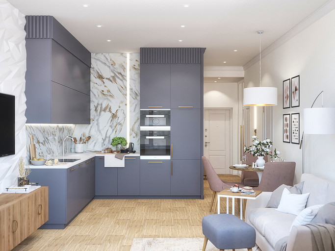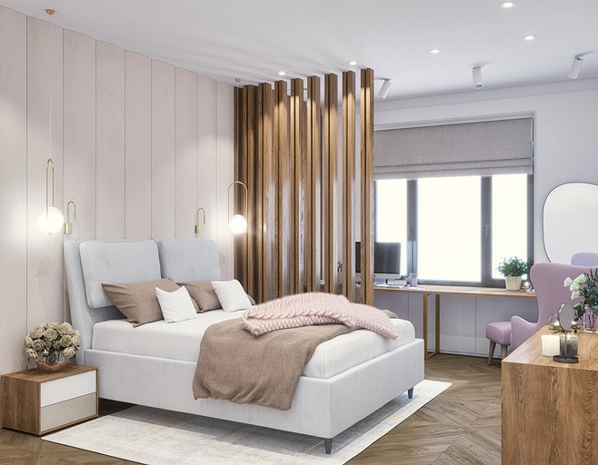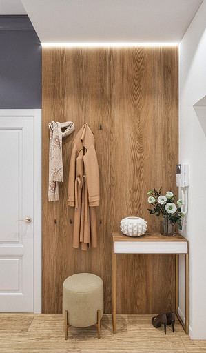 Стильная евродвухкомнатная квартира площадью 68,8 кв.м для молодой женщины. Интерьер выполнен с использованием натуральных фактур и материалов, светлых и темных акцентов. Квартира просторная, функциональная и современная. Предусмотрено большое количество мест хранения — 2 просторные гардеробные для личных вещей хозяев. Все помещения разработаны нами в полном объёме, что максимально упрощает процесс реализации.