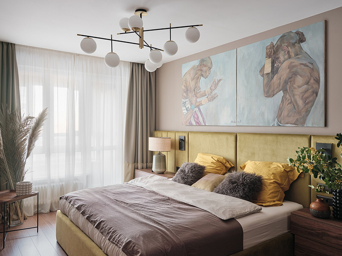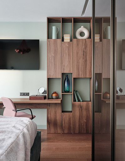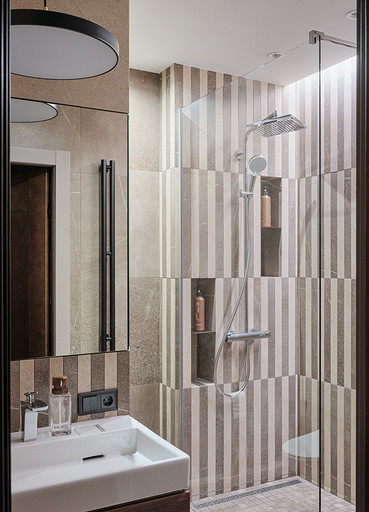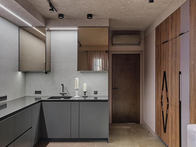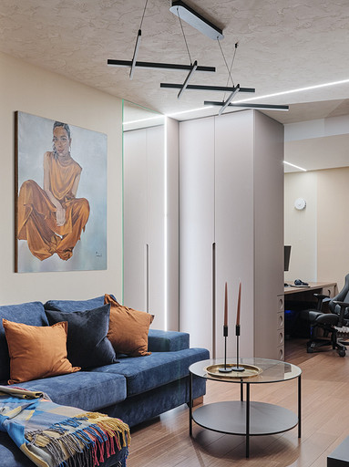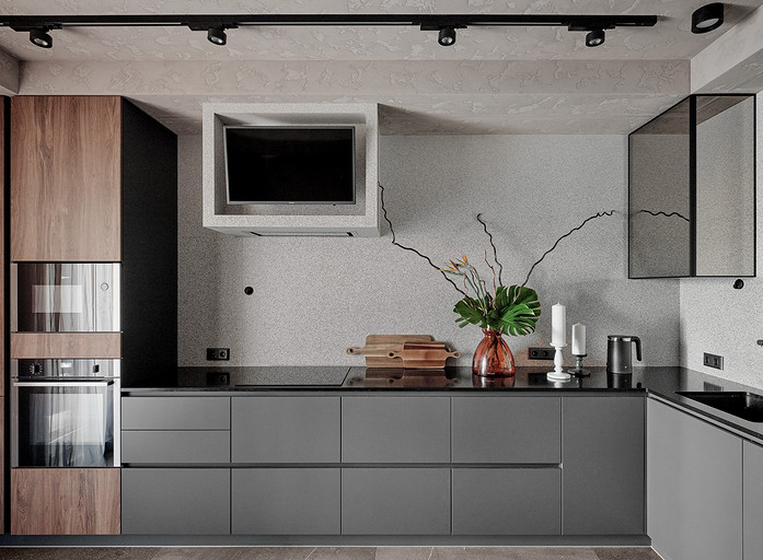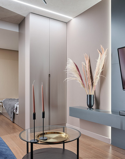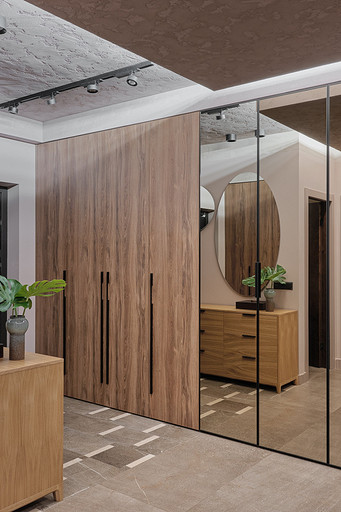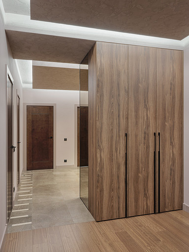 Стилистическое направление жилья было выбрано ориентируясь на потребность владельцев, его можно отнести к современному направлению. Заказчикам хотелось обустроить квартиру с максимально возможным хранением, а также не загромождать интерьер. Планировка квартиры оказалась удачная, с просторными комнатами и большим холлом. Также в квартире расположены две ванные гостевой санузел и постирочная.