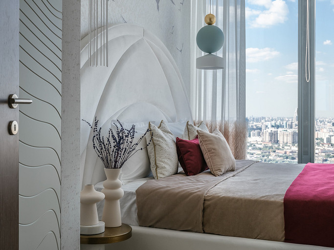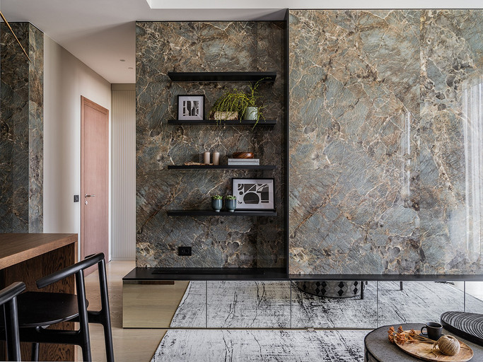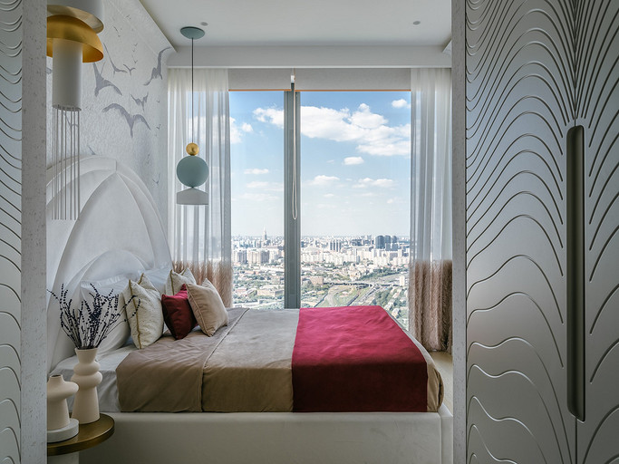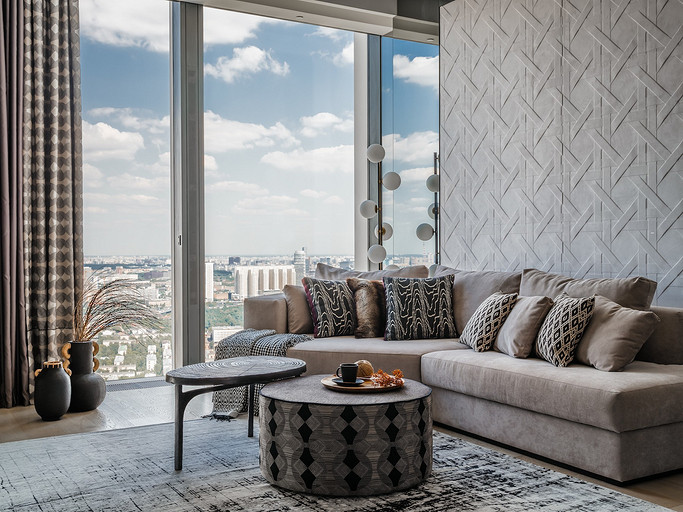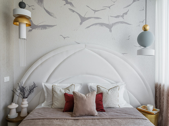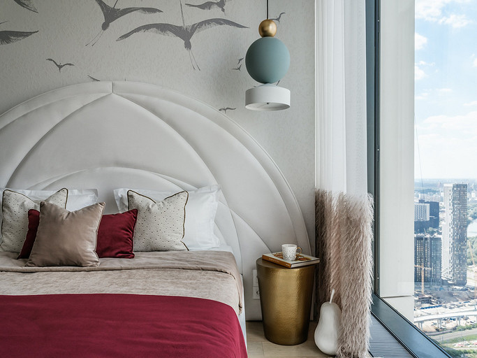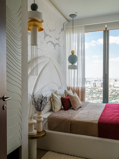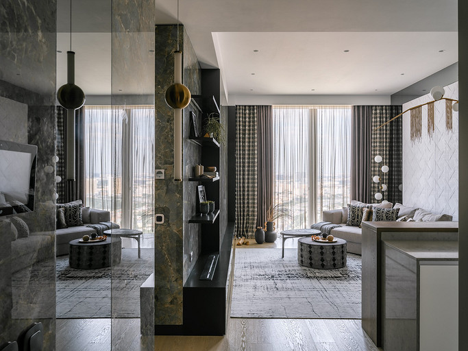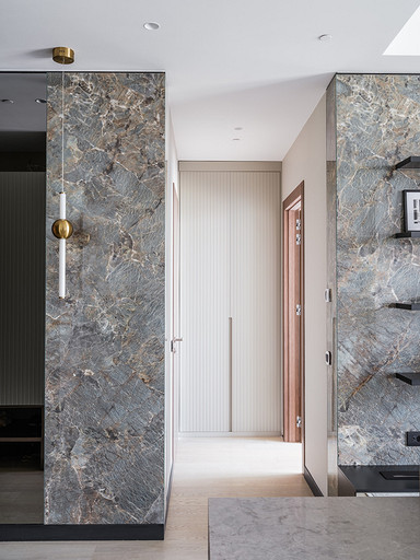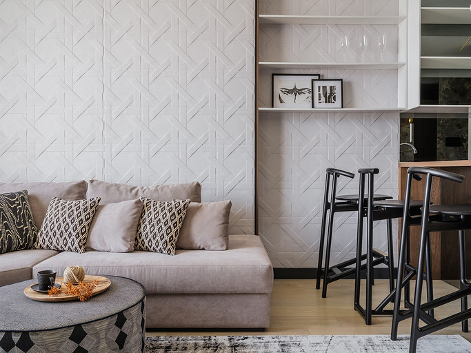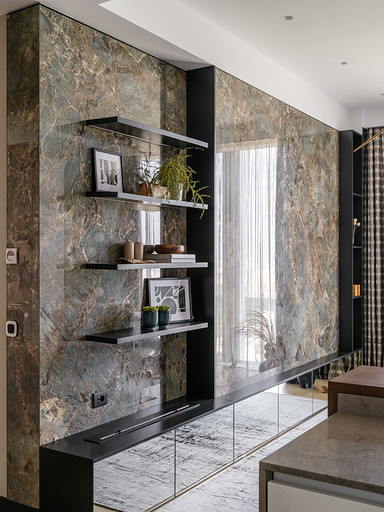 - Стены: краска Mylands, керамогранит MIRAGE, обои в спальне Architector, декоративный барельеф @gospodindecorator.ru, настенное покрытие в гостиной Arte