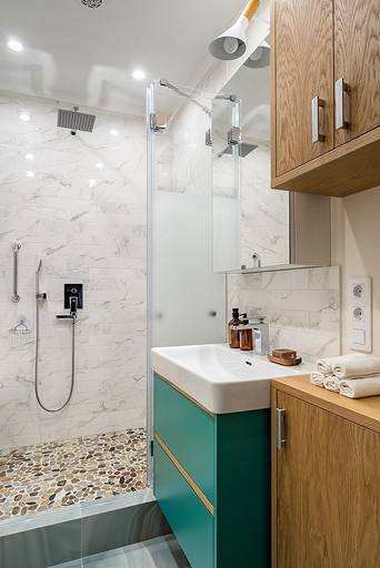 - Пол: инженерная доска Finex, плитка Winckelmans, керамогранит в ванной Ceracasa