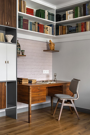- Мебель: корпусная мебель изготовлена по эскизам дизайнеров в мастерской студии, письменный стол, стулья, кресло и обеденный стол винтаж