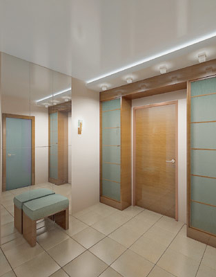 Встроенные шкафы для одежды по обе стороны от входной двери заметно экономят место. Аогромное, от пола до потолка, зеркало зрительно увеличивает пространство прихожей