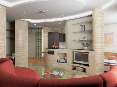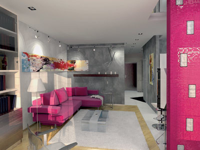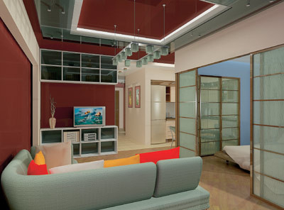 Гостиная отличается рискованной неординарностью цветового решения, сложной режиссурой освещения