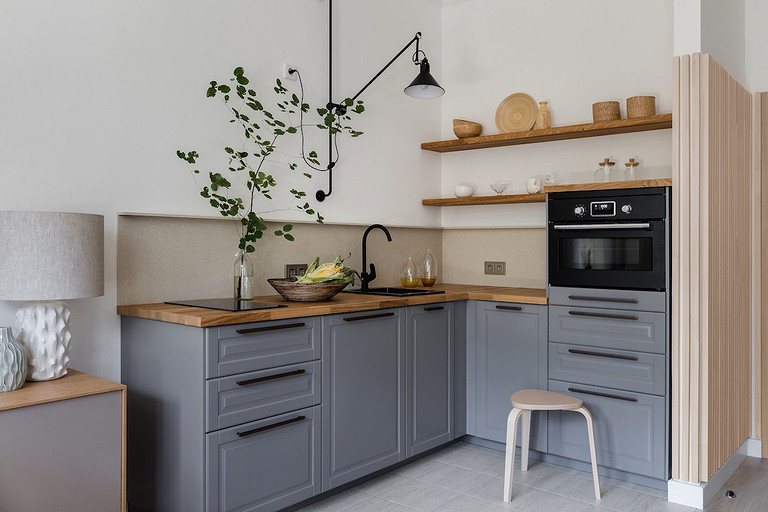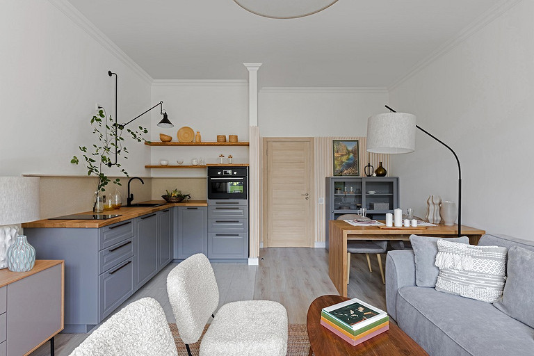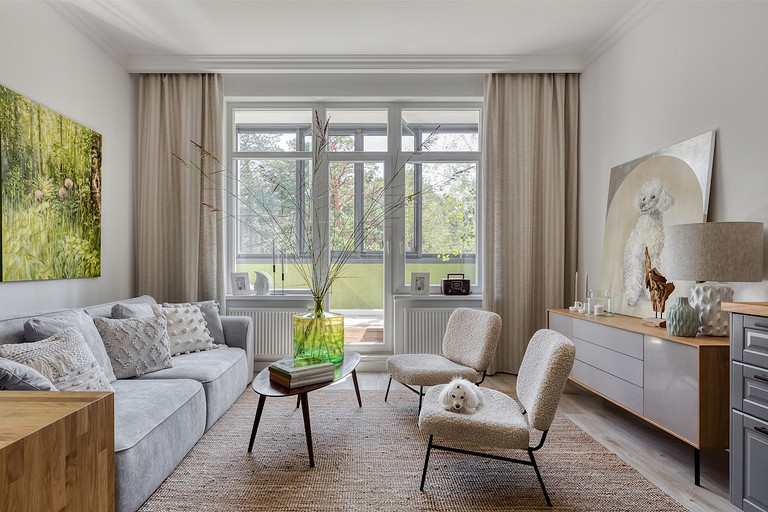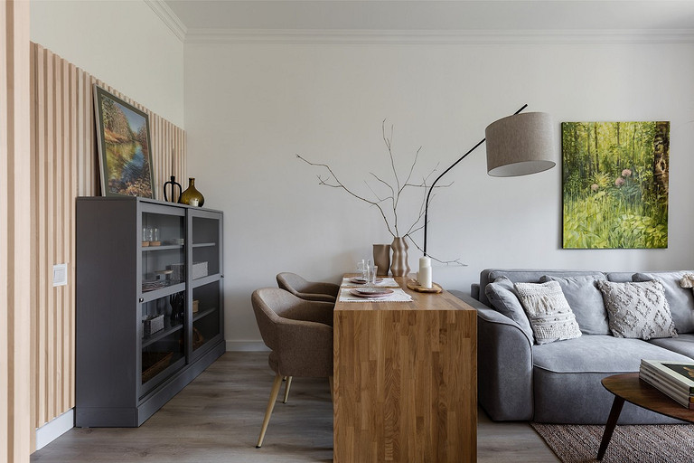 - Мебель: диван, стулья divan.ru, стол Archpole, кресла и журнальный столик Zara Home, кухня и шкаф-витрина ИКЕА, тумба под телевизор SKDesign, кресло-кровать Imodern