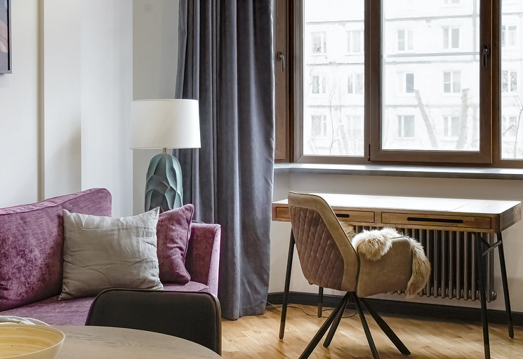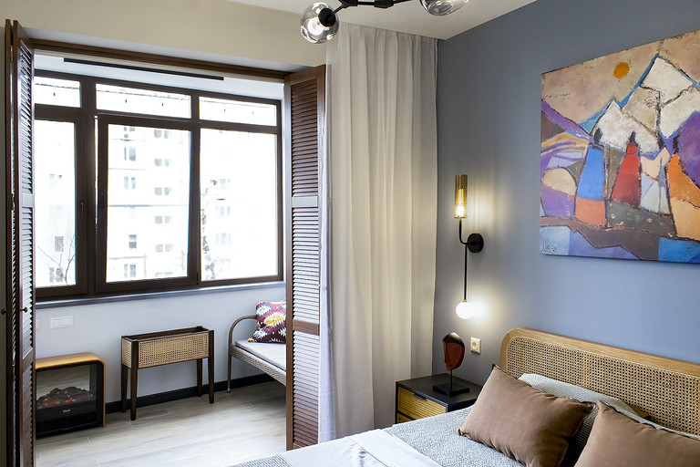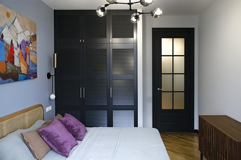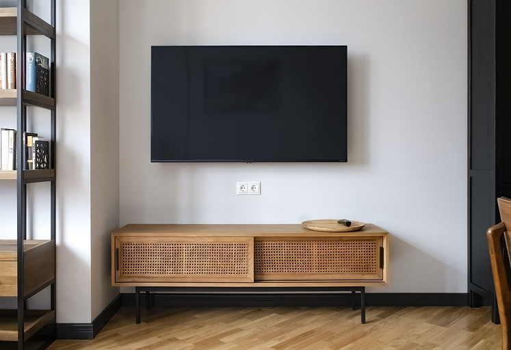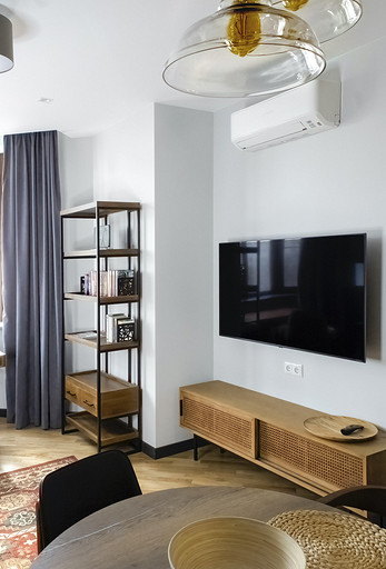 - Мебель: кухня, шкаф-витрина ИКЕА, кровать, комод, тумбочки в спальне, тумба под ТВ и придиванный столик La Redoute, стеллаж и письменный стол Moonzana, комод в прихожей Teak House, вешалка для одежды в прихожей изготовлена в My Loft, встроенные шкафы lacobel, диван в гостиной One and Home, обеденный стол на заказ в частной мастерской