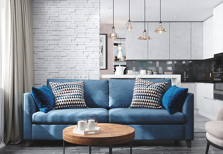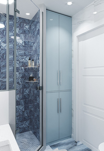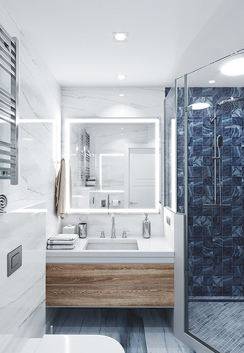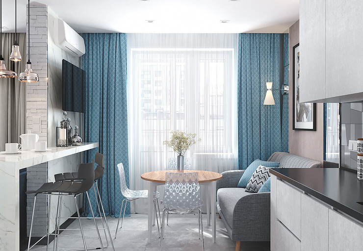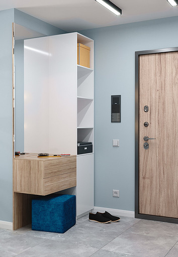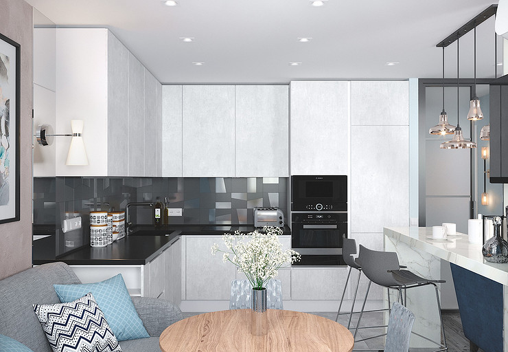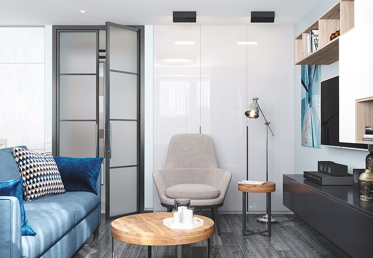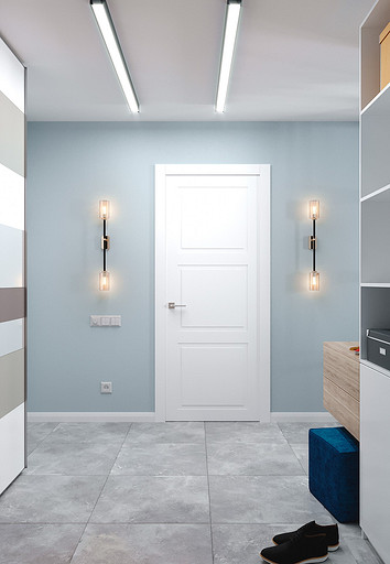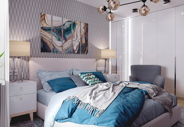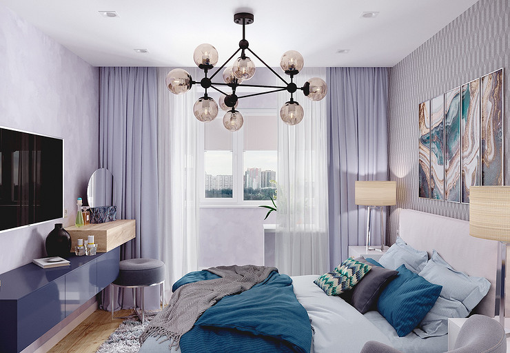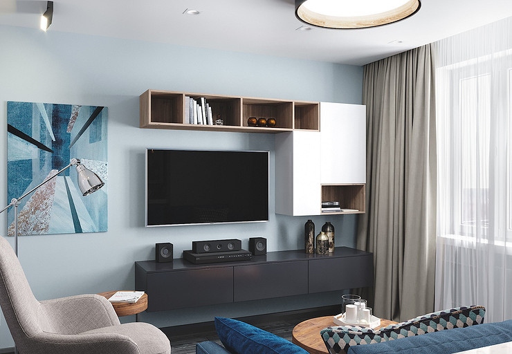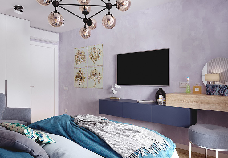Дизайн-проект интерьера квартиры с индивидуальным планировочным решением в ЖК Гринада. Общая стилистика ультра современная с четкими линиями и консервативными основными цветовыми решениями. При этом общая дизайн-концепция разбавлена голубыми, синими, бирюзовыми и сиреневыми акцентами с добавлением теплых деревянных предметов мебели. Декорирование интерьера очень нежное и романтичное и прекрасно гармонирует с весьма простой и лаконичной основой всего пространства.