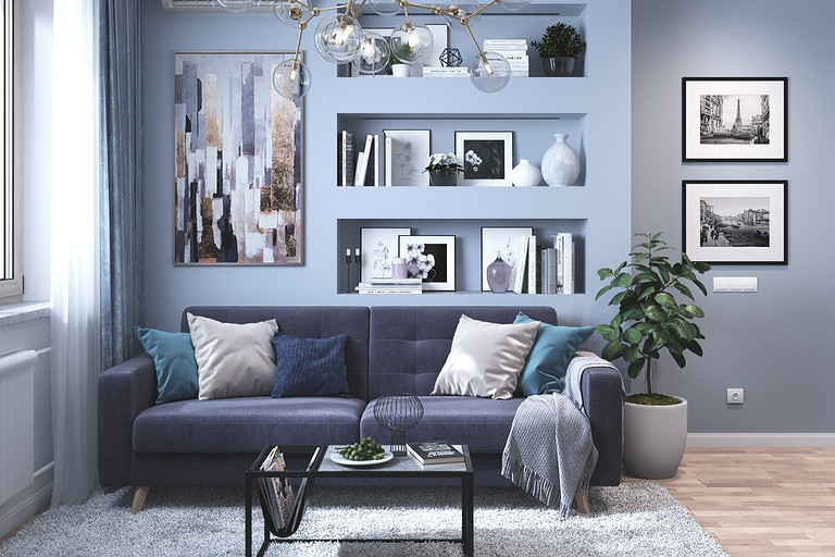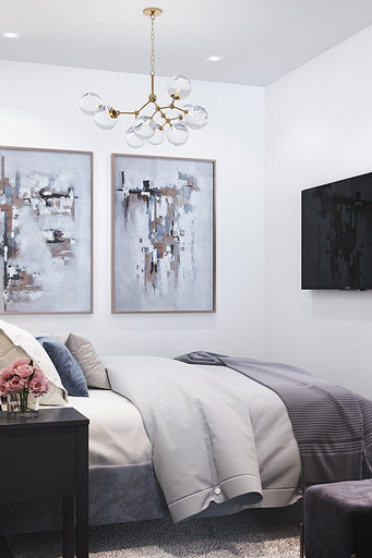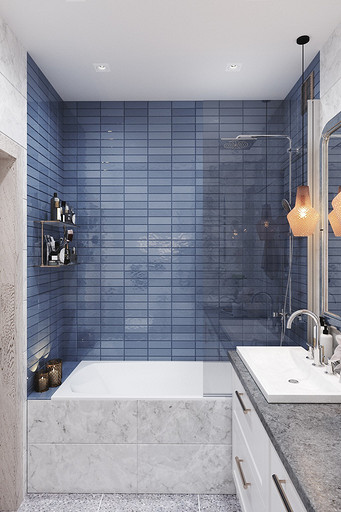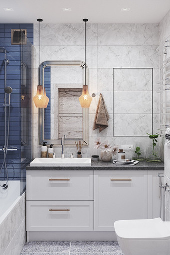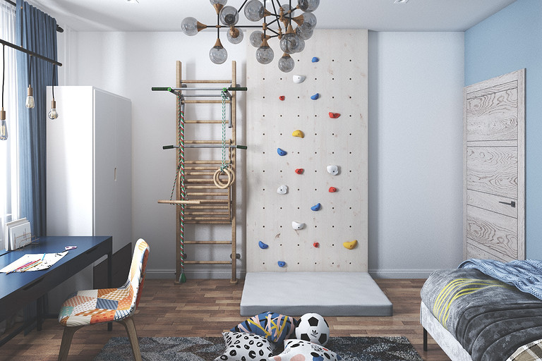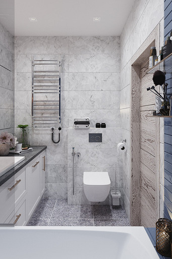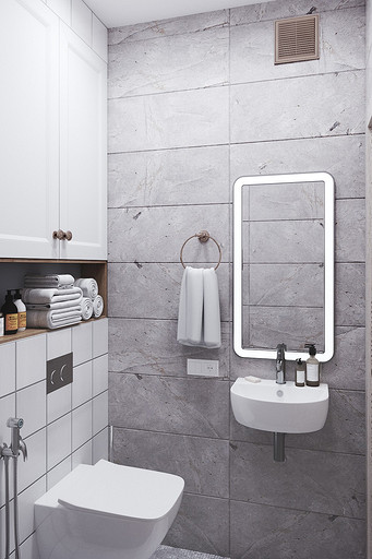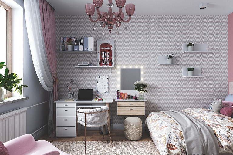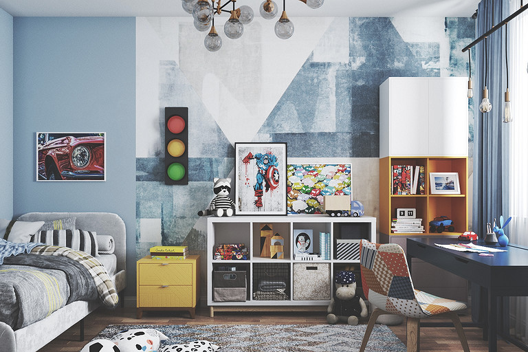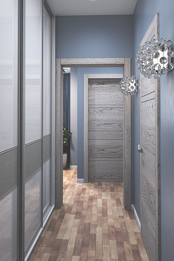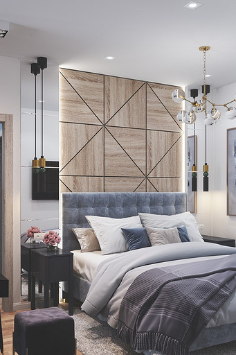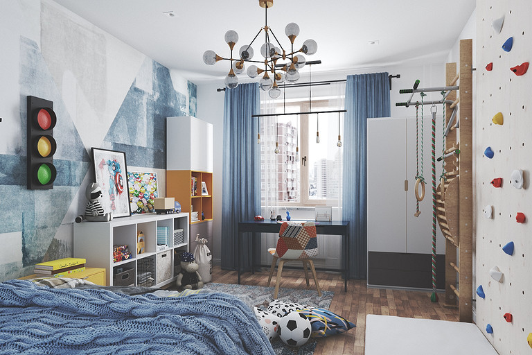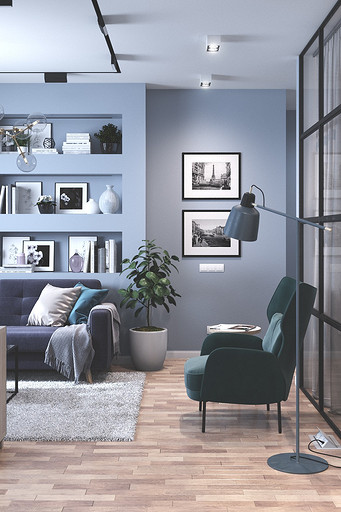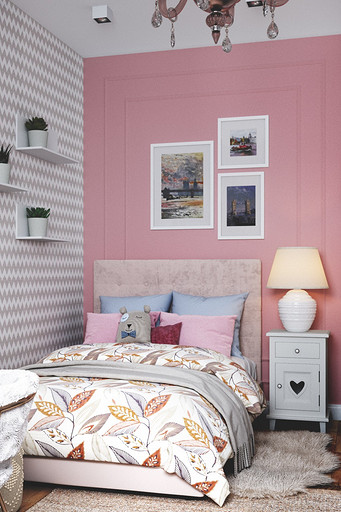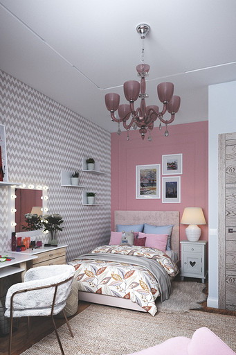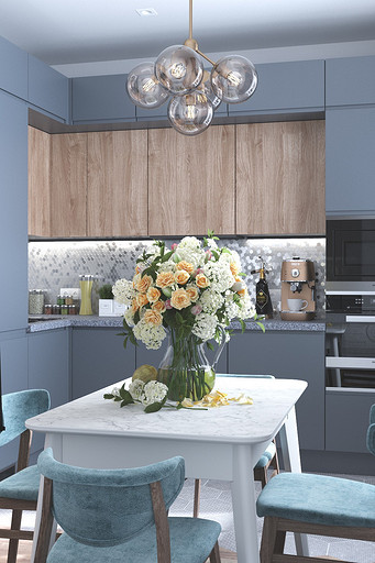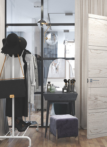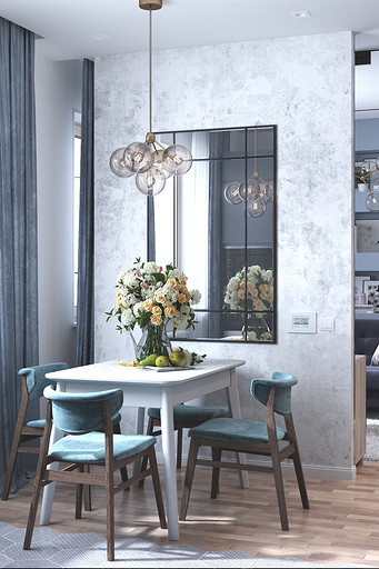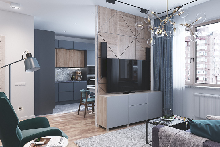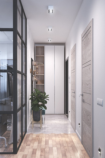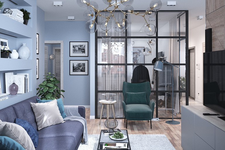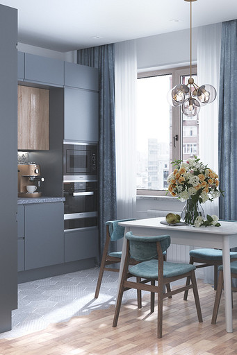 Основным пожеланием заказчиков в отделке было как можно больше светлых тонов и наличие натуральных материалов. Поэтому в качестве общей основы отделки стен был взят совсем светло-серый цвет с добавлением бирюзовых, розовых и голубых оттенков по разным помещениям, деревянных светлых текстур и серого бетона в качестве стильных акцентов для разнообразия. За основное напольное покрытие была выбрана трехполосная паркетная доска насыщенных медово-коричневых оттенков. Во всех же мокрых зонах, включая часть кухни, а также в прихожей на полу мы сделали стильную раскладку керамогранита. Очень стильным архитектурным дополнением к просторной планировке основного помещения квартиры кухни-гостиной стала стеклянная угловая перегородка в стиле лофт, отделяющая маленькую, но очень уютную спальню. Мы выбрали прозрачный тип стекол, чтобы дневной свет из двух окон смежной комнаты с легкостью проникал в небольшую зону отдыха хозяев квартиры. При необходимости уединиться в спальне, мы повесили светлые декоративные портьеры и, чтобы визуально увеличить пространство данного помещения, использовали зеркальные панели на стенах и много декоративного интересного освещения. Хочется еще отдельно немного рассказать о кухне-гостиной. Помещение является общим, но разделено функциональной отдельной перегородкой на две важные зоны: обеденную и для просмотра ТВ. Композиция кухонной мебели не громоздкая очень компактная, в ней предусмотрена только самая необходимая бытовая техника и удобное пространство для приготовления пищи. Антресольные шкафы позволяют максимально использовать места для хранения кухонной утвари. Гостиная получилась очень комфортной: на большом диване может разместиться целая семья для совместного времяпрепровождения, а дополнительно рядом мы разместили уютную зону для чтения с мягким креслом и напольным светильником, где можно просто приятно попить кофе или полистать любимый журнал. Стена за диваном получилась очень функциональной. Мы ее достроили искусственным образом, спроектировав вместительные ниши, где заказчики в будущем смогут разместить любые памятные фотографии в рамочках, а также сувениры, привезенные из поездок. Гардеробная комната, как мечтали заказчики, была спроектирована, но получилась очень маленькая. Это не помешало ей быть очень удобной и функциональной. В качестве мебели мы использовали навесную шведскую систему полок, контейнеров, штанг и ящиков. Детские комнаты были спроектированы по-настоящему волшебными, учитывая пожелания об идеальном пространстве каждого из детей: 15-ти летней девочки и 4-х летнего мальчика. В основе концепции комнаты дочки стилизованный интерьер под современные молодежные пространства в Англии. Колористическая задумка получилась сдержанная с розовыми и серыми оттенками, плюс мы добавили светлых деревянных текстур, флизелиновые обои с текстурой шеврон на одной стене и золотистые цвета в виде акцентов. Модный настенный декор постерами английской тематики украсил подростковую комнату девочки и сделал ее неповторимой. Концепция детской для сына получилась не менее интересной. Самой привлекательной частью отделки стала акцентная стена с настоящей ручной росписью в современном стиле. Мы выбрали абстрактный рисунок, который лег в основе колористической схемы. Гармо