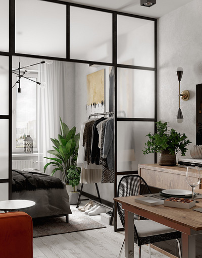 Дизайн интерьера для квартиры-студии общей площадью 30 м2. Очень современный дизайн объединенного помещения создавался для молодой семейной пары без детей. Интерьер получился очень функциональным и удобным, на достаточно небольшой жилой площади удалось разместить кухню, гостиную, спальню и даже обеденную зону, которая трансформируется за счет индивидуальной заказной модели комода со скрытым расположением обеденного стола. Наличие раскладного дивана позволяет гостям оставаться с ночевкой. Основной высокий гардероб для хранения вещей расположили в прихожей, которому по плану от застройщика уже была предусмотрена вместительная ниша. Дополнительно в спальне предусмотрели открытую конструкцию для навески вещей, которая является очень современным решением, визуально не загромождает пространство и отлично дополняет наш интерьер в стиле лофт. Чтобы сделать помещение квартиры более уютным, был добавлен всевозможный интересный декор, особое же внимание дизайнеры уделили размещению растений в различном исполнении, которые очень стильно смотрятся в интерьере, а зеленый цвет листвы способствует отдыху и сильно оживляет пространство квартиры.
