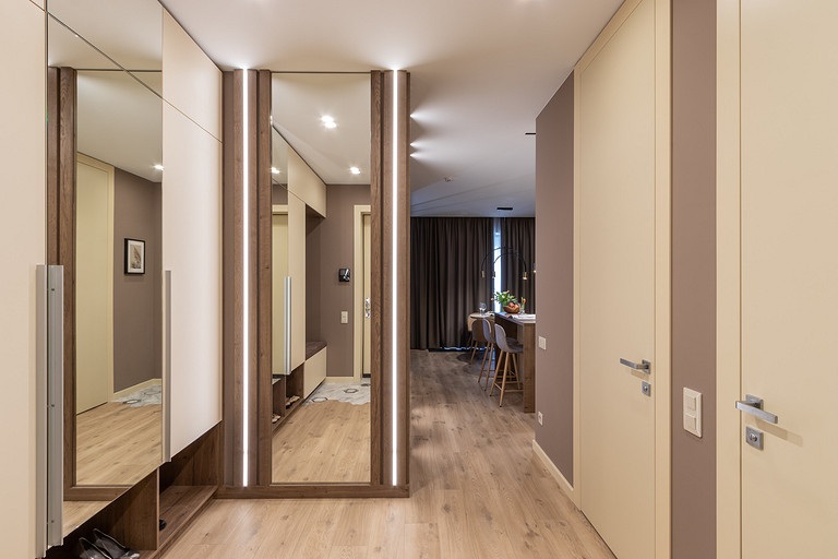 Изначально планировка квартиры была неплохая, но нам удалось сделать её ещё функциональнее. Прихожая довольно просторная, там мы смогли организовать много мест хранения. Ещё одна фишка прихожей — зеркало в полный рост с подсветкой по бокам. В таком зеркале вы всегда будете выглядеть отлично, а ещё получаются красивые селфи. Межкомнатных дверей в квартире всего две — в ванную и в санузел. Они специально сделаны до потолка, чтобы визуально увеличить высоту. Их мы заказывали на фабрике «Волховец». Далее прихожая плавно перетекает в просторную кухню-столовую.