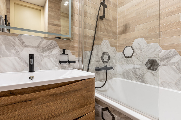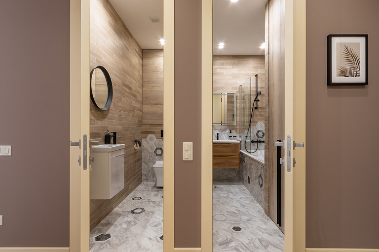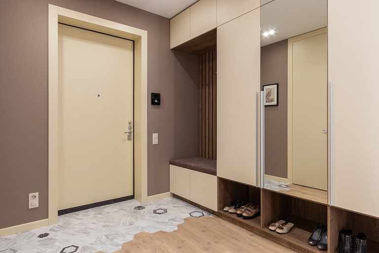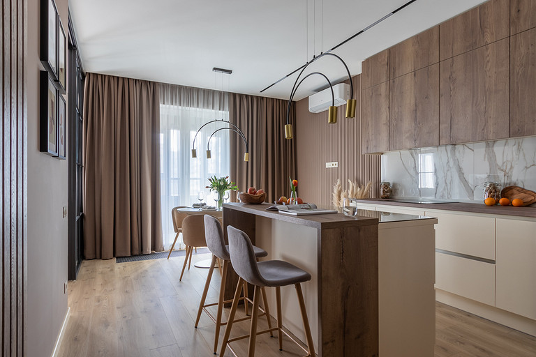 В отделке решили придерживаться единства всех помещений: все стены выкрашены в один цвет — сложный, глубокий, кофейный оттенок. Но за счёт разнообразия фактур, таких как шпонированные рейки на стенах и гипсовые 3D-панели, отделка не кажется однообразной. В мебели также фигурируют всего два цвета — тёплый бежевый и дуб-табак. Шкафы и кухня выполнены в отделке ЛДСП фабрики Egger. На полу мы также применили только два материала — кварцвиниловый ламинат Quick-Step (он обладает большей прочностью и влагостойкостью, нежели обычный ламинат) и плитка в форме гексагонов фабрики EQUIPE. Посмотрите, какой интересный переход плитки в ламинат нам удалось сделать в зоне прихожей! На стенах в ванной плитка из той же коллекции, к ней мы добавили плиту под дерево фабрики Rondine. Как акцент — сантехника из чёрного металла фабрики Sturm.