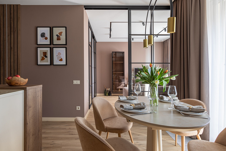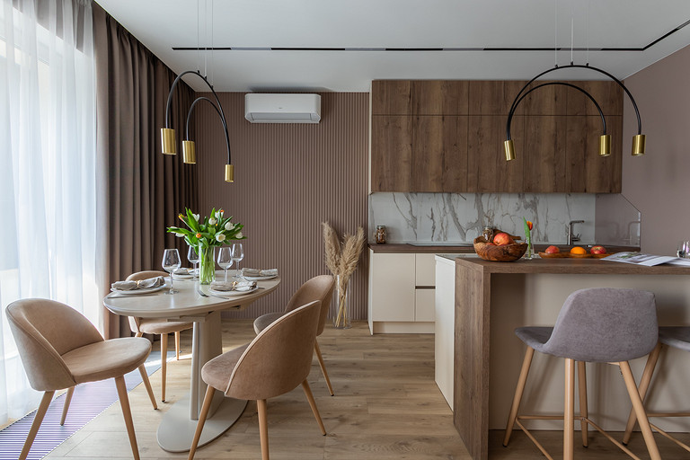 Когда супруги приезжают в Петербург, они любят принимать гостей, поэтому организовать красивую обеденную зону было очень важно. Заказчица — фанат готовки, и было принято решение расположить остров. Он хоть и небольшой, но за ним можно готовить и болтать с друзьями. Им, кстати, будет удобно сидеть за стойкой, примыкающей к острову.
