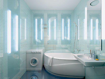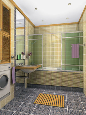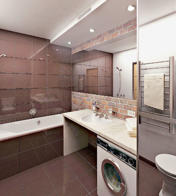 и уменьшения шума при стирке. Отделка плиткой под бамбук перекликается с деревянным карнизом и дверцами шкафчика