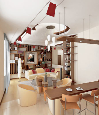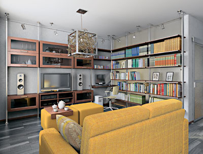 Асимметричное оформление кухонного проема- ответ «падающему» стеллажу. Диваны крепко стоят на ножках, визуально уравновешивая «нестабильность» стеллажей