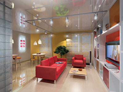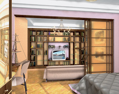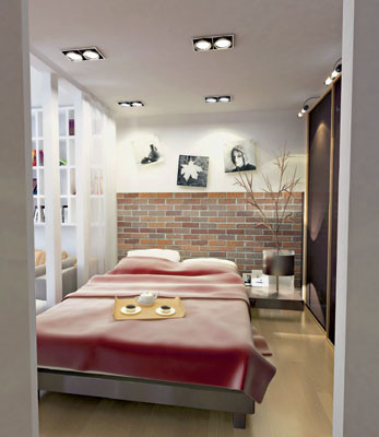 Подиум высотой 15см, на котором расположена спальня, позволяет смотреть телевизор прямо с кровати.
