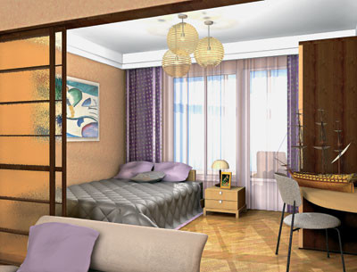 Сиреневый цвет заметно оживляет серо-коричневую гамму спальни.