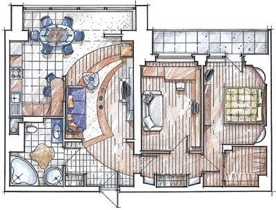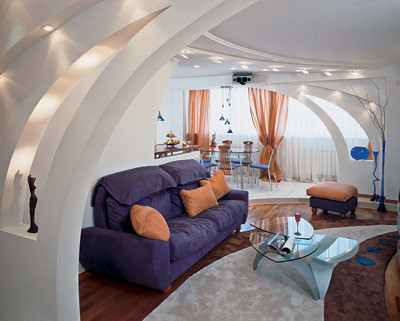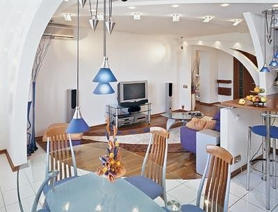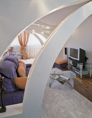 Трехкомнатная квартира общей площадью 81,2 м2 с лекальными линиями пола и потолка и ажурными конструкциями вместо стеновых перегородок. Читать далее...
