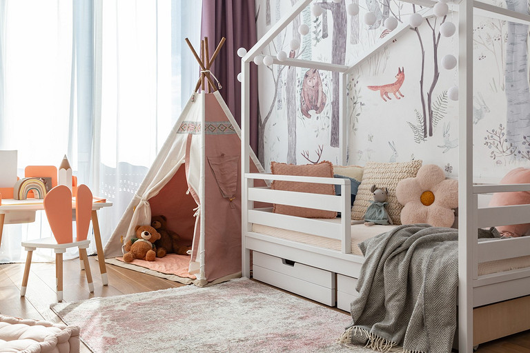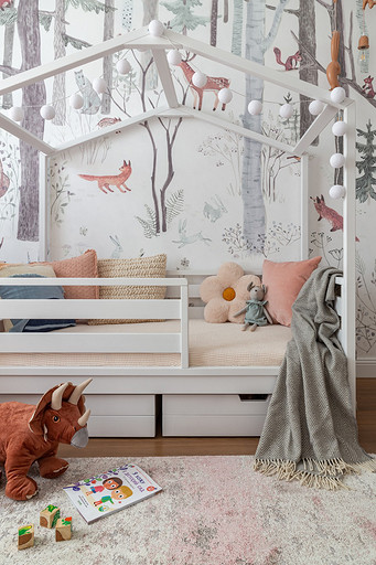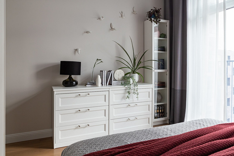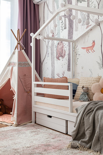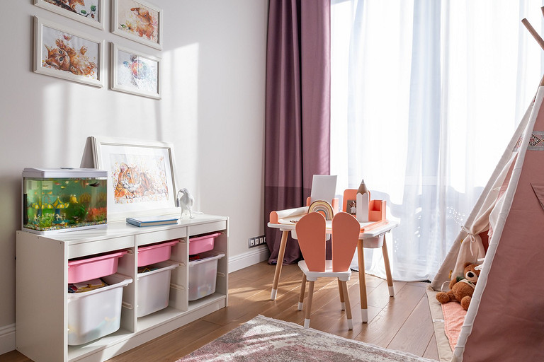 - Мебель: комод под ТВ и прикроватные тумбы «Равновесие», стол и стулья в детской Roombabyroom
