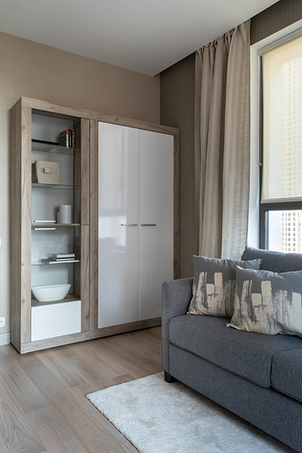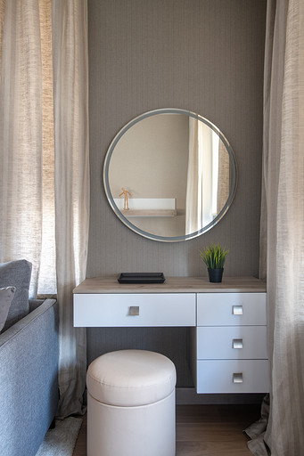 - Мебель: диван Inmyroom, шкаф, стол, туалетный столик и полки Hoff, пуф «ОГОГО Обстановочка!»