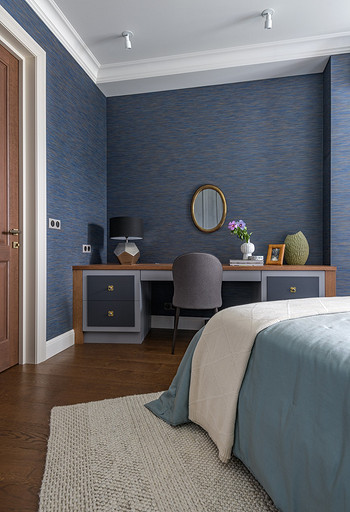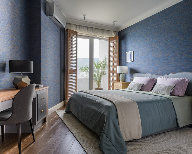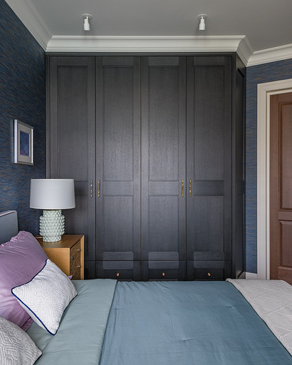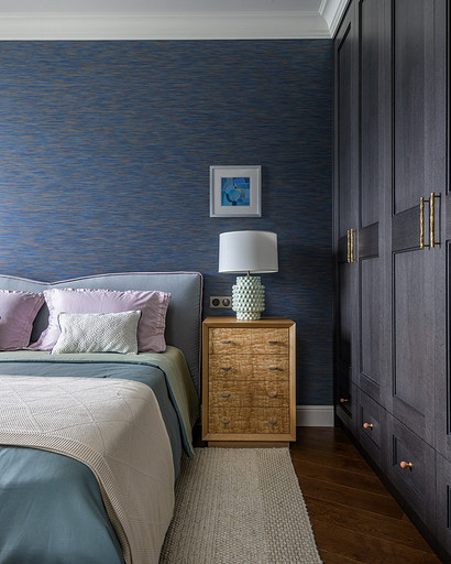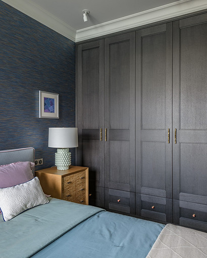 - Мебель: шкаф, стол с тумбами, прикроватные тумбы, жалюзийные двери — столярная мастерская «Юнинформ мебель», кровать Felis