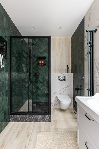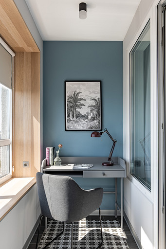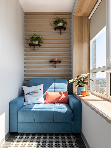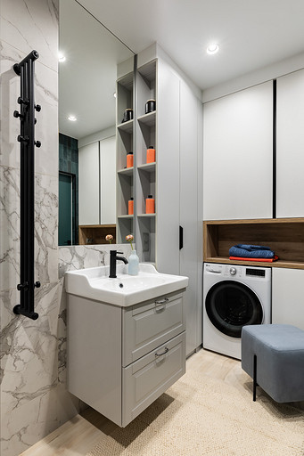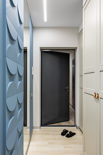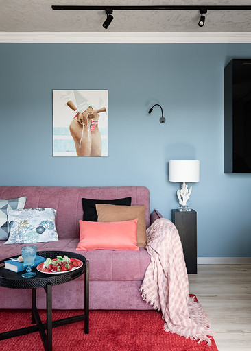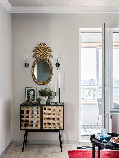 Эта уютная небольшая студия студентки венского института находится на последнем этаже нового многоэтажного комплекса. Из панорамных окон открывается живописный вид на город. Это послужил основой идеей проекта: внутреннее пространство является продолжением внешнего. Сочная цветовая гамма интерьера сливается с линией горизонта и гармонично сочетается с природными красками неба, листвы, заката и рассвета. Небольшая площадь — 30м2 ставила не простую задачу, вместить все необходимое, сделать это органично, компактно и в то же время эргономично. На полу единое покрытие – кварц винил объединяет пространство, зонирование происходит за счет акцентов. В небольшом узком коридоре поместился длинный шкаф IKEA, напротив него зеркало от пола до потолка, которое создает эффект призмы для пространства, а стеновые панели Circle Orac Decor привлекают своей геометрией и цветом. Кухню установили в нише, дополнив ее островом. Столешница выполнена из натурального мрамора и кварцевого агломерата. Зона окна увеличена за счет панелей и превратилась в уютное место для отдыха. Над диваном в гостиной выделяется картина Олеси Алыниной «Девушка в купальнике» . Яркий ковер, декоративные подушки ИКЕА, журнальный столик, H&М Home, плед и настольная лампа, Zara Home дополняют интерьер. Слева от балкона расположили будуар, его центральной зоной стало зеркало «Ананас». На балконе организовали кабинет и спальное место. В этой зоне уложили керамогранит и более мощный теплый пол. Планировка застройщика изначально была очень правильно, благодаря ей ванная комната получила настолько правильную геометрию, что здесь мы смогли поместить целый хозяйственный блок, санузел и душевую.