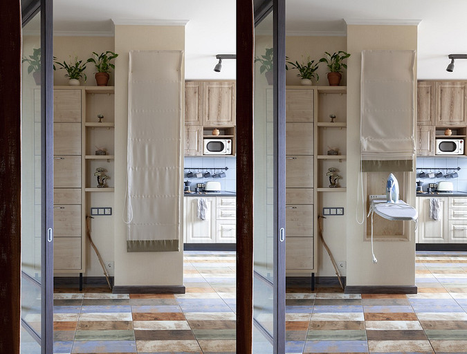 - Мебель: обеденный стол «ДревПром», ротанговая мебель rotang.spb.ru, складная гладильная доска Hafele, обеденные стулья ИКЕА