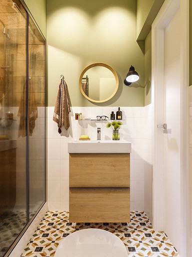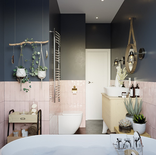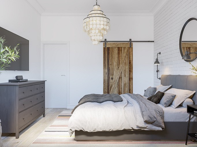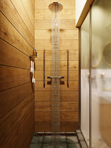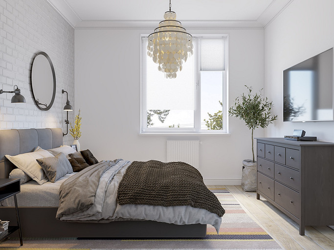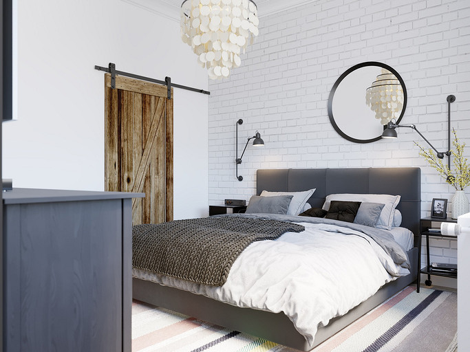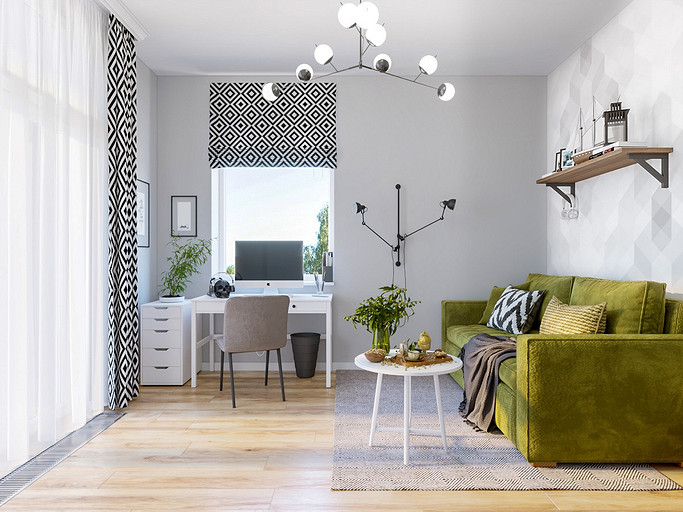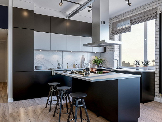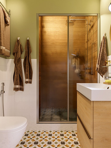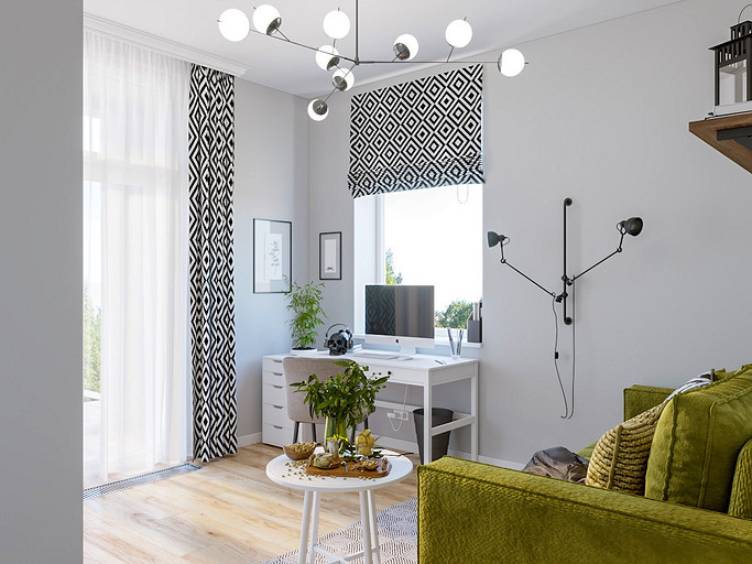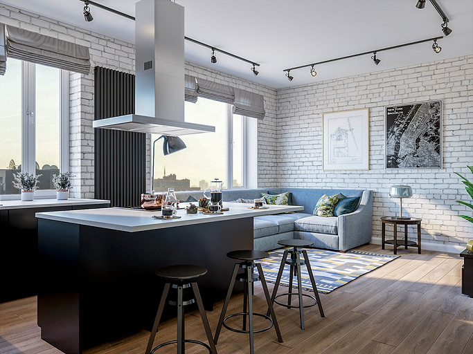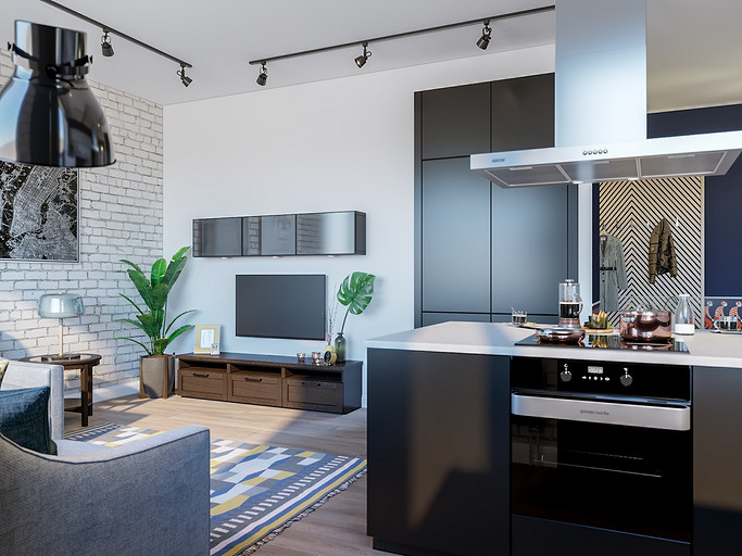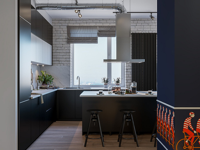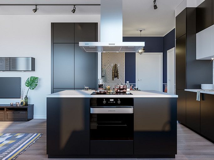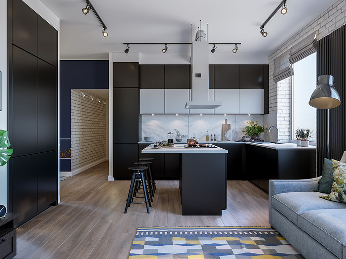 Концепция проекта квартиры в одном из столичных ЖК. Проект создан для семьи из 3-х человек. Заказчикам нужны были изолированные спальни и просторная зона кухни-гостиной, где можно устраивать приемы гостей и вечеринки. Чтобы это реализовать, объединили зону гостиной и кухни, при этом часть жилой зоны решено было отдать под гардеробную в прихожей, а в кухне оборудовать остров с барной стойкой. Расположение окон в квартире очень удачное: все комнаты получились светлыми, при этом даже в ванной есть окно. В кухне-гостиной получилось расположить очень вместительный гарнитур с кухонным островом, в который встроили варочную панель и конечно же предусмотрели достаточно мощную вытяжку. В спальне очень интересная история с зеркалом. Оно неслучайно имеет ассиметричное положение. Дело в том, что в процессе работы над проектом заказчица работала в Японии и просила какой-то символ или напоминание об этой удивительной стране. Мы пробовали повесить в изголовье и панно, и веера, и даже кимоно, но что-то нас не устраивало и в итоге остановились на таком зеркале. Оно символизирует восходящее солнце, а при проветривании комнаты перламутр на люстре играет мелодию ветра. В санузлах удалось сочетать в отделке стен плитку и покраску. Конфигурация санузлов нестандартна. Например, помещение хозяйского санузла в плане узкое и вытянутое, но получилось найти решение и выполнить все пожелания заказчика — даже отдельно стоящую ванну разместили у окна. В комнате сына диван с механизмом трансформации. Так как сын уже взрослый, в будущем заказчики планируют использовать эту комнату как кабинет и гостевую спальню.