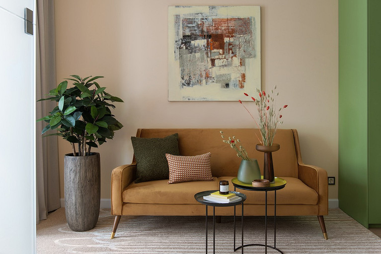 - Декор: картины — Ольга Шагина, вазы и подушки Chiarohome, CasaMare, постельное белье «Кунгсбломма» — ZeHome, искусственные растения Treez Collection