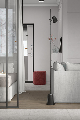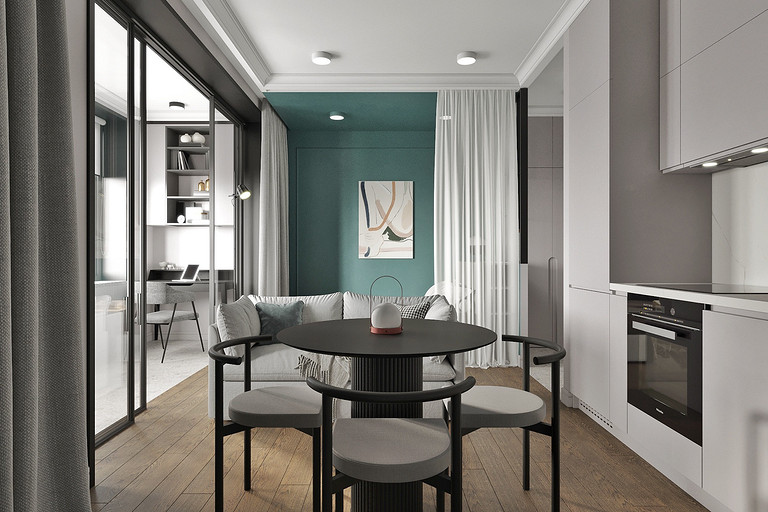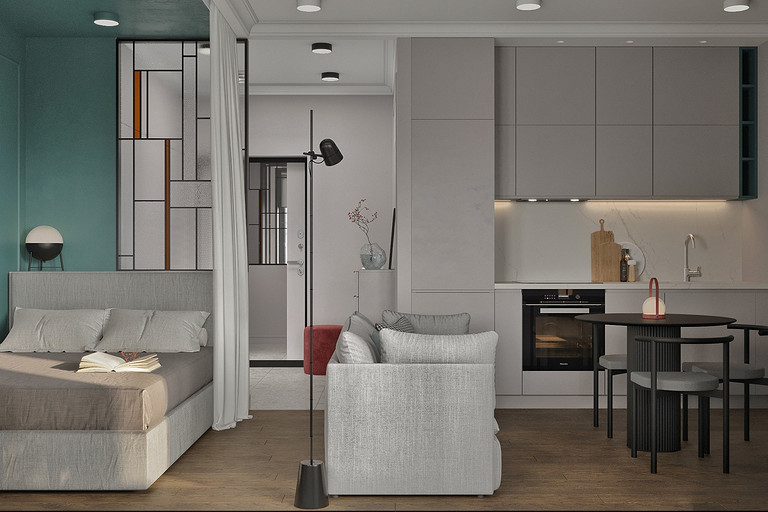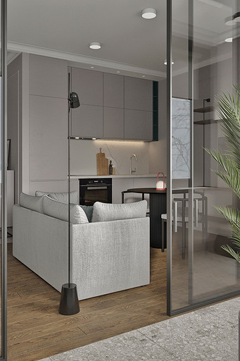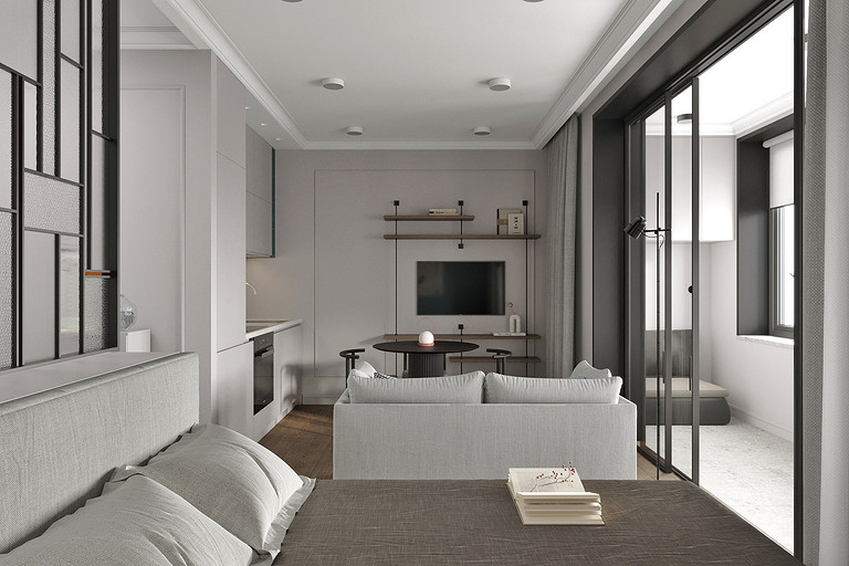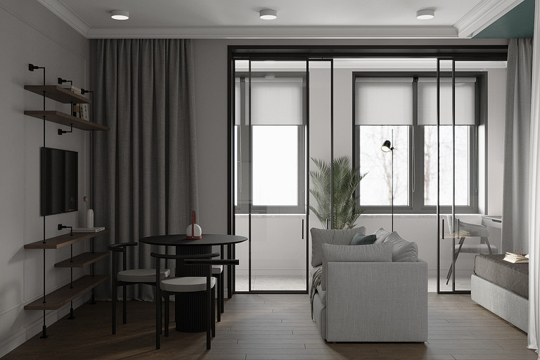 Проект квартиры в ЖК Октябрьское поле для мамы заказчицы, которой в 2015 году делала проект и реализацию ее квартиры. Площадь квартиры всего 32 квм (с лоджией), но необходимо было организовать пространство для полноценного проживания, с гостиной, в которой бы разместилась обеденная зона, раскладной диван для дочери и внука на случай, если останутся ночевать, зону ТВ, отдельную кухню, обязательно кровать для мамы, рабочее место, тк мама еще работает и конечно места хранения. Над планировочным решением пришлось поломать голову, но в итоге удалось разместить все необходимое.