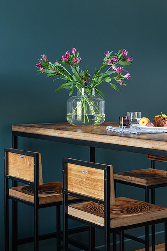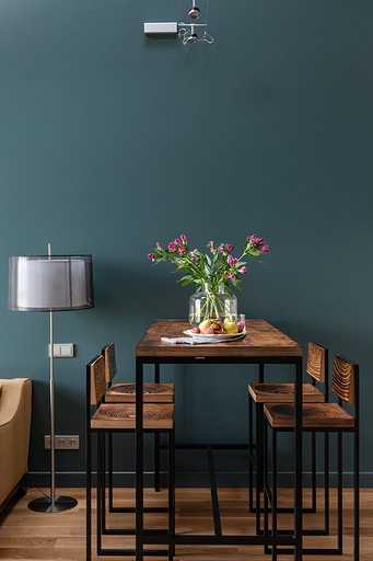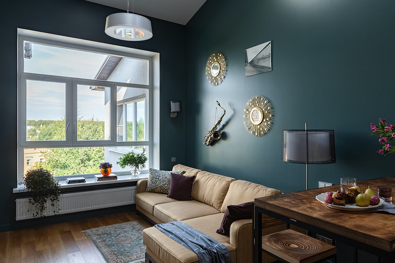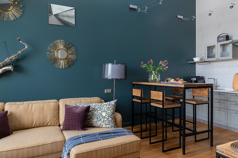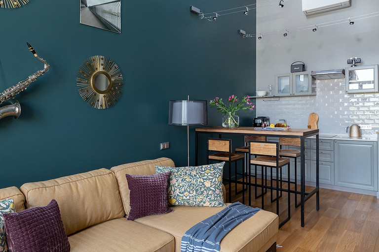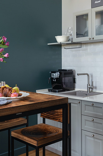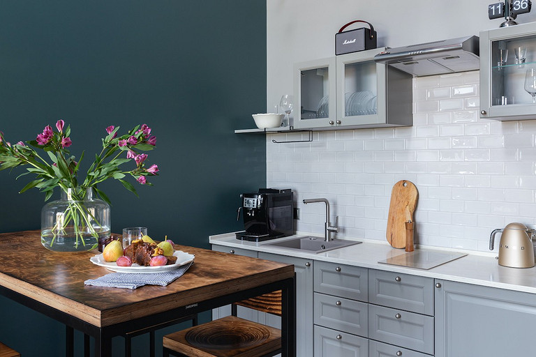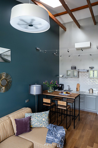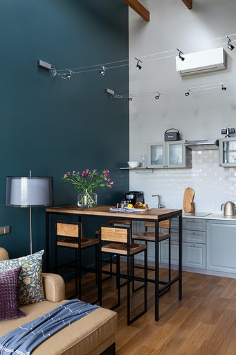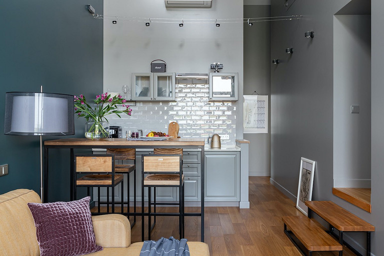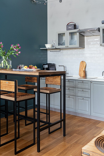 - Мебель: кухня от фабрики «Акварель», раскладной диван Dantone Home, барный стол Metalframe, стулья Archpole