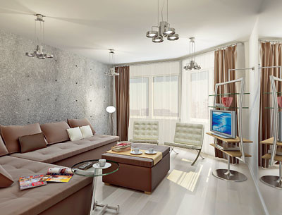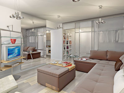 Гостиная получилась просторной благодаря минимальному количеству мебели- все вещи можно хранить