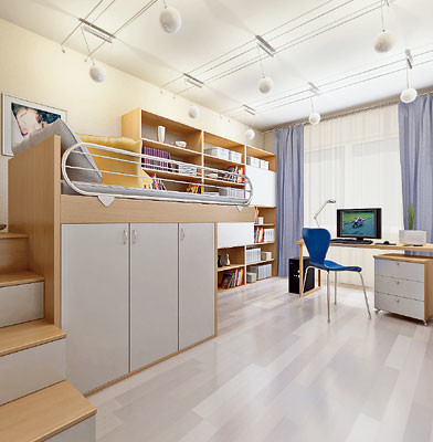 Для освещения комнаты сына используются струнные системы, ночник у кровати и настольная лампа