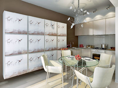 Шкафы-модули с дверцами из матового стекла и встроенными светильниками вместительны, выглядят как декоративное панно и обеспечивают мягкую подсветку кухни-столовой