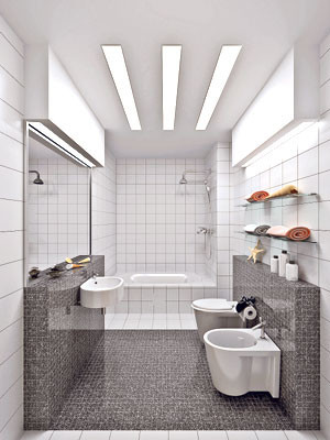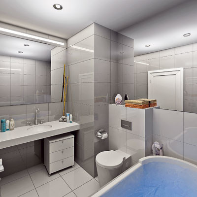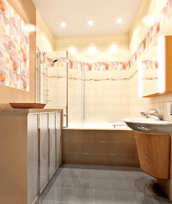 В ванной комнате два типа светильников: встроенные в потолок галогенные и люминесцентные над зеркалом
