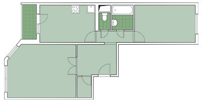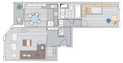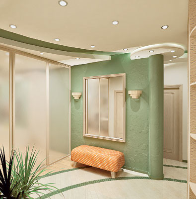 Вид из гостиной на прихожую. В нишу последней встраивается стеллаж для сувениров и книг. Другой вариант использования этого пространства- узкий шкаф для одежды. Пуф играет сразу несколько ролей: это и столик, и сиденье, и место для хранения вещей