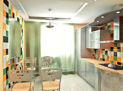 Зеркало на стене обрамлено той же разноцветной плиткой, которой облицован кухонный «фартук». Над столом предусмотрена полка для приправ