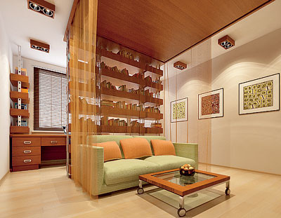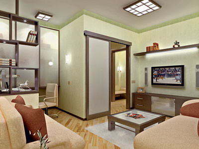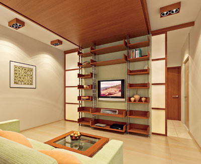 Гостиная-кабинет. Для подсветки полки над телевизором могут использоваться только люминесцентные лампы- галогенные и лампы накаливания сильно нагреваются