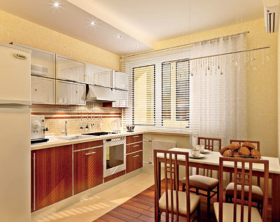 В кухне комбинация из жалюзи и штор позволяет варьировать убранство помещения.