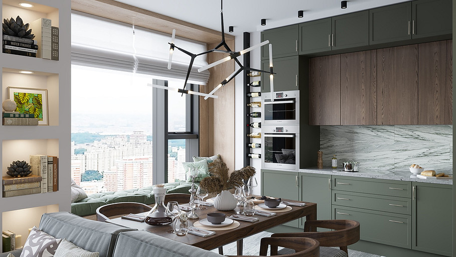 Кухня и гостиная имеют общее пространство, наполненное дневным светом. Интерьер выполнен в современном стиле, преимущественно в светлых тонах