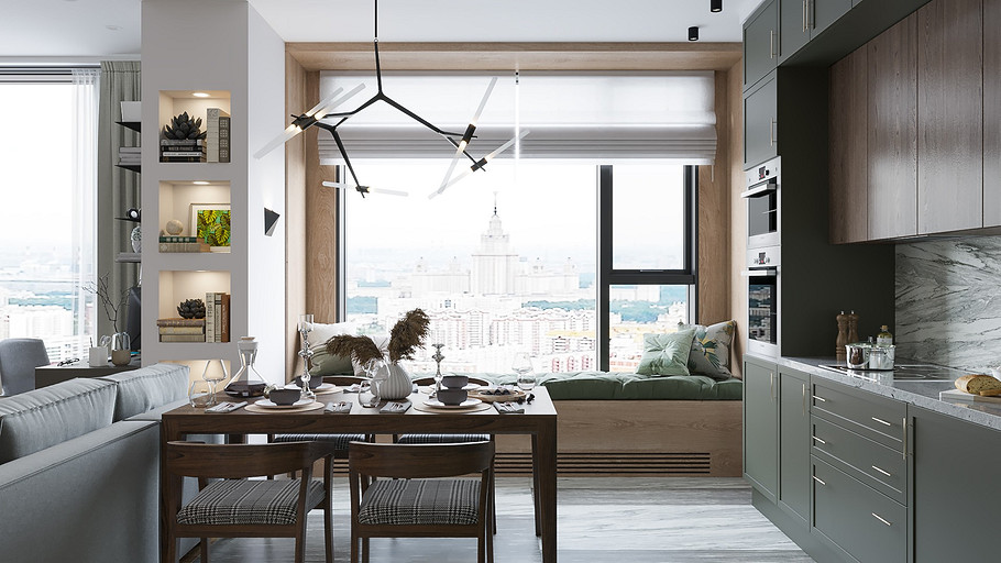 Компактная, но очень симпатичная столовая группа находится в непосредственной близости к кухне, что повышает эргономику и уровень комфорта