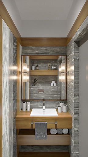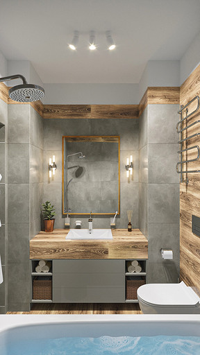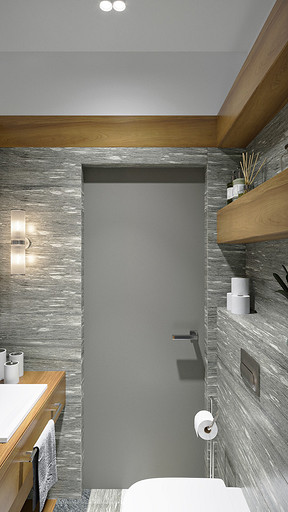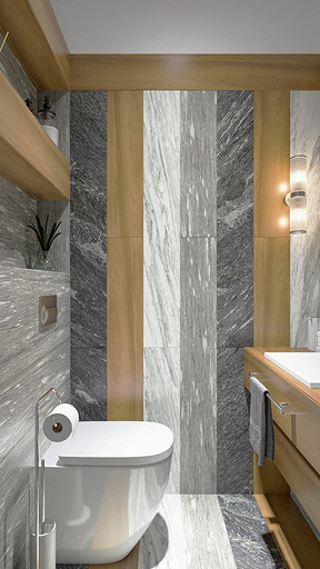 Палитра для гостевого санузла подобрана спокойная и приглушенная. Сочетание серых оттенков с цветом дерева