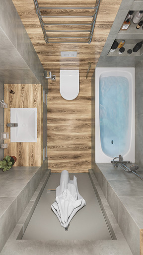 Планировка ванной комнаты организована таким образом, что умывальная (раковина и зеркало) и помывочная (ванная чаша и душ) зоны находятся в нише и тем самым добавляю комфорт в использовании