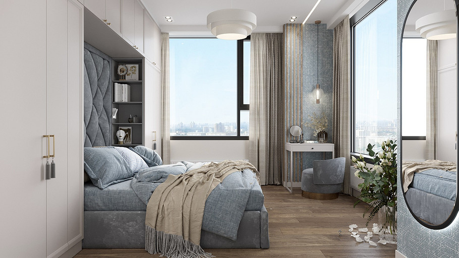 Спальная комната имеет два панорамных окна, что дает видовое и световое преимущество этому пространству. Палитра интерьера стала продолжением небесной картины за окном