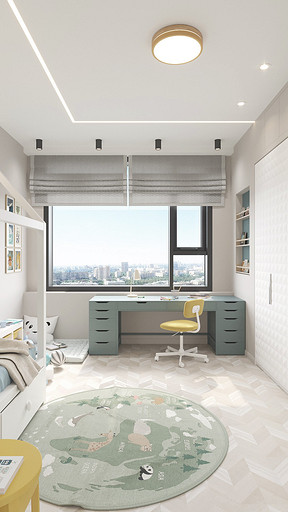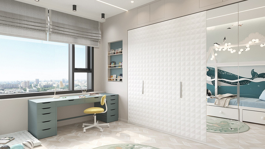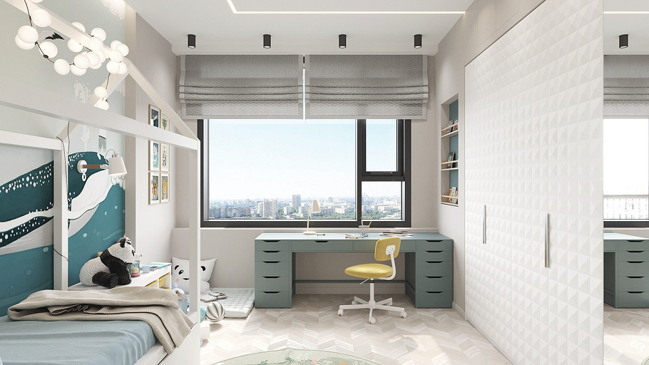 Для этой детской комнаты была утверждена морская палитра с акцентным цветом морской волны. В дополнении — работает желтый оттенок, а фоном послужил бежевый и белый цвет