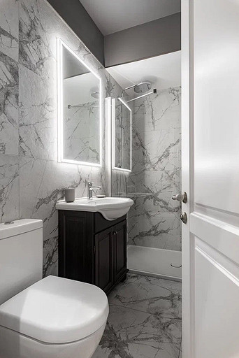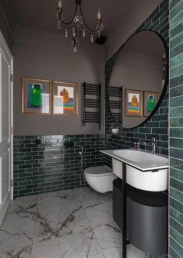 - Стены: краска Benjamin Moore, обои Loymina, плитка Eguipe и Ariane