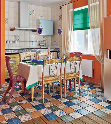 пестрой плитке (изумрудной, терракотовой и темно-розовой), напоминающей лоскутное одеяло,- символ домашнего уюта
