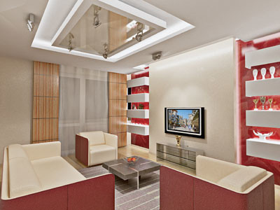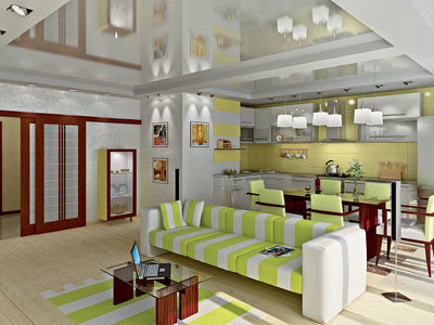 Для визуальной коррекции высоты помещения используется глянцевый натяжной потолок