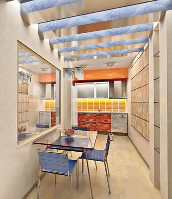 Вид из гостиной на кухню-столовую. Напротив обеденной группы предусмотрен изящный «стеллаж» из гипсокартона