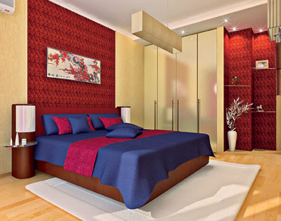 Оригинальное решение- обить выступы стен при входе фактурной тканью, а не оклеить обоями или оштукатурить. Полочки в спальне стеклянные